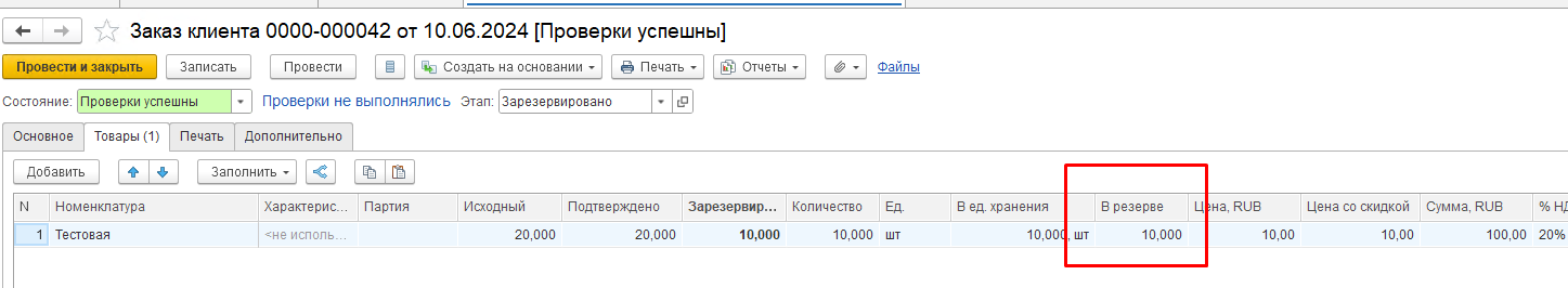 При постановке / корректировке / снятии резерва под заказ клиента, в документе «Заказ клиента» в табличной части с товарами в колонке «В резерве» отображается актуальное количество зарезервированного товара с учетом склада резерва
