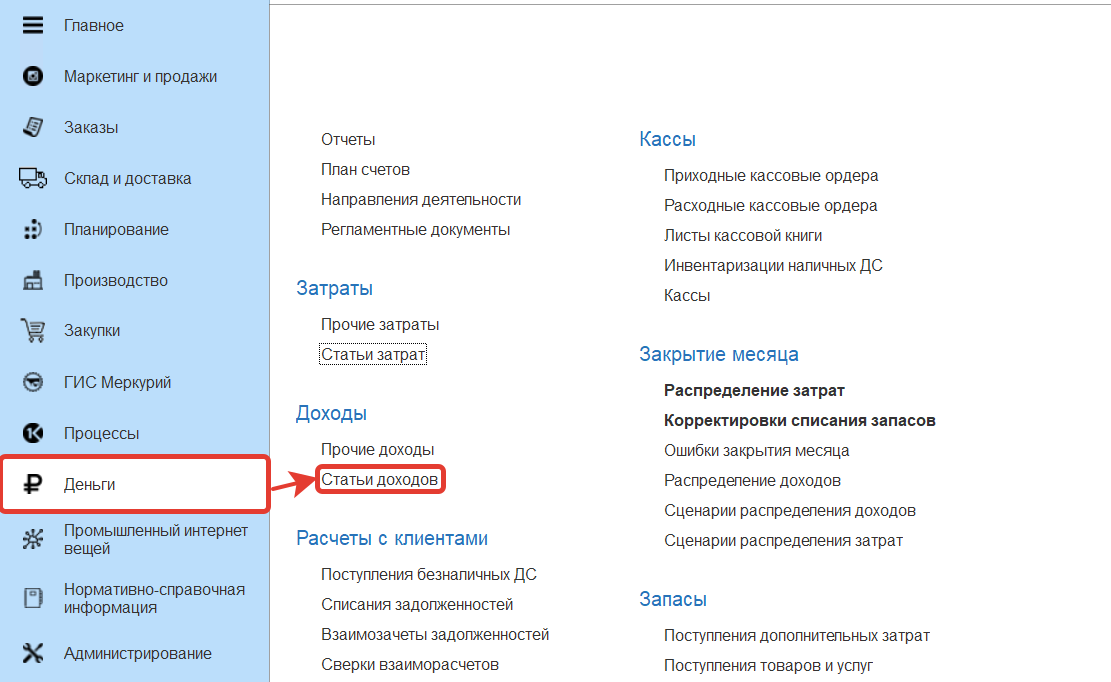 Справочник "Статьи доходов" расположен в разделе "Деньги" в подсистеме "Доходы"