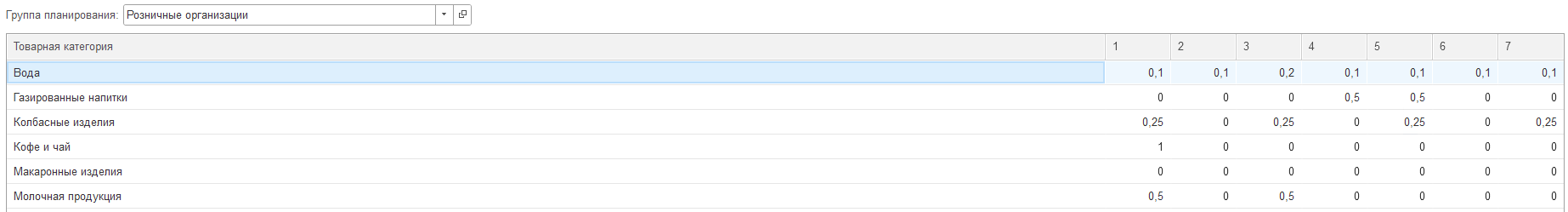 Появляется список товарных категорий и столбики для указания доли отгрузок на этот день в течении недели, где 1 - ПН, 2 - ВТ и т.д.