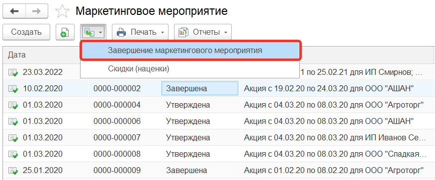 После фактического завершения акции, необходимо на основании маркетингового мероприятия сделать процедуру завершения в системе. Для этого с формы акции нужно нажать на кнопку "Завершение маркетингового мероприятия".