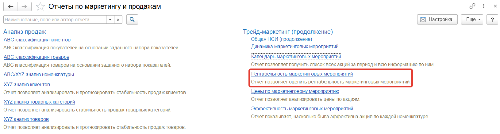 Отчет "Рентабельность маркетинговых мероприятий" расположен в разделе "Маркетинг и продажи" в подсистеме "Аналитика" - "Отчеты".
