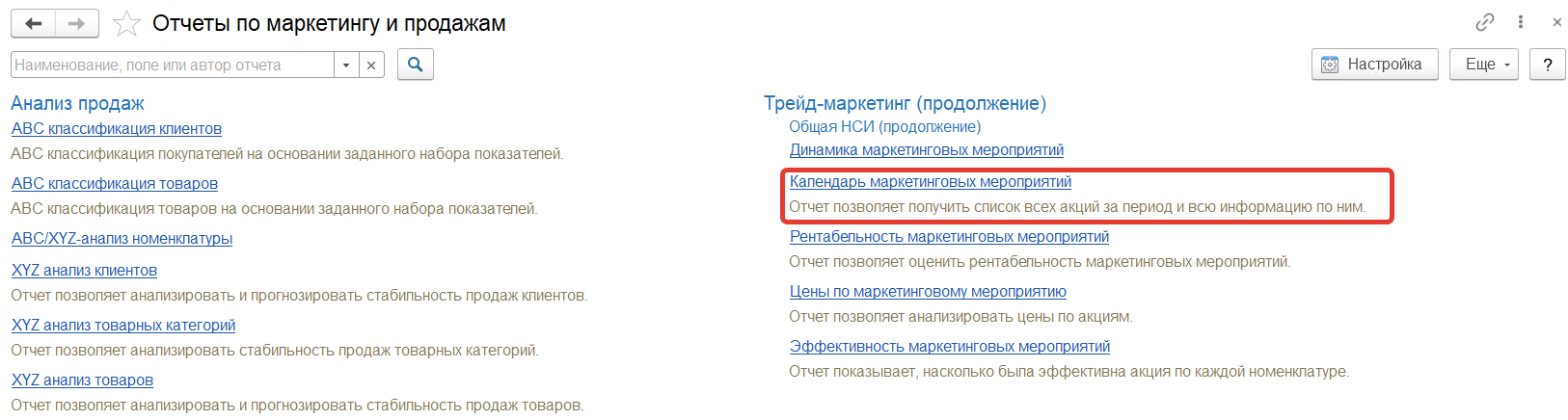 "Календарь маркетинговых мероприятий" расположен в разделе "Маркетинг и продажи" в подсистеме "Аналитика" - "Отчеты".