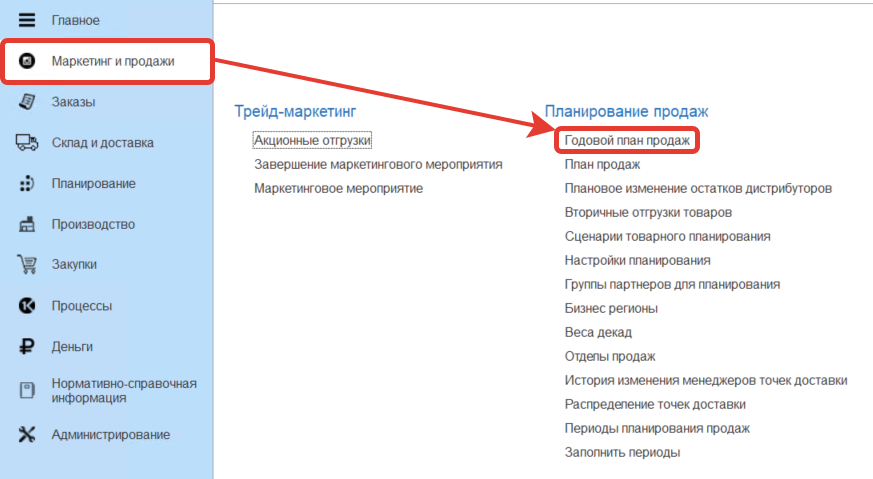 Документ "Годовой план продаж" расположен в разделе "Маркетинг и продажи" в подсистеме "Планирование продаж"