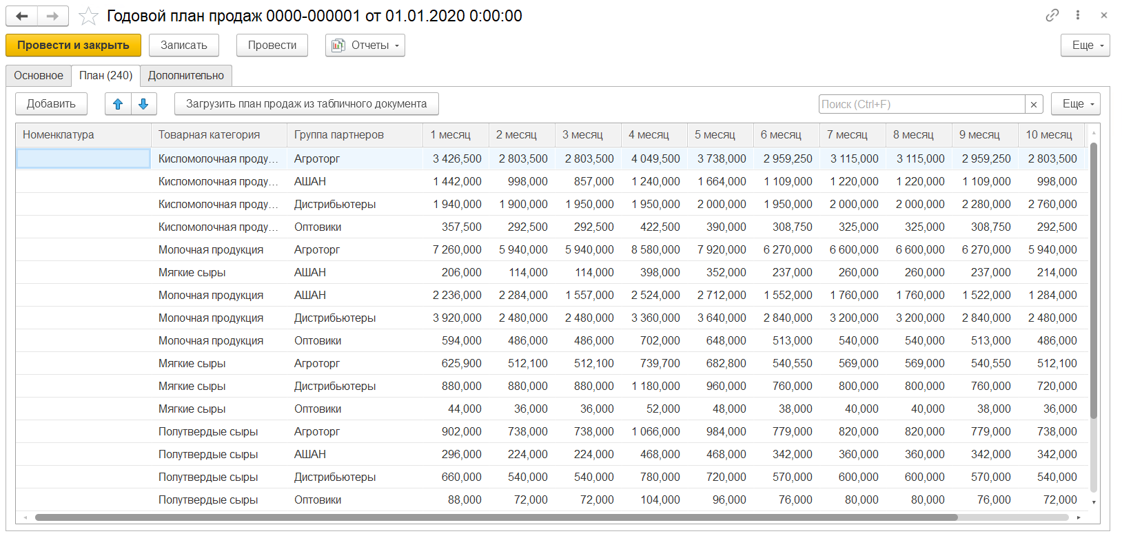На вкладке "План" указывается план продаж в разрезе товаров и групп партнеров для планирования.