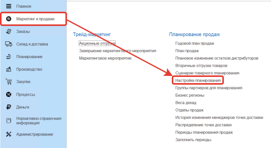 Справочник "Настройки сценариев планирования" расположен в разделе "Маркетинг и продажи" в подсистеме "Планирование продаж"