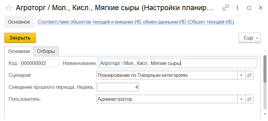 - Смещение прошлого периода в неделях - количество недель, которые нужно отсчитать назад от начала периода планирования, чтобы получить конец базового периода. Базовый период - это тот, за который берутся данные для анализа планирования