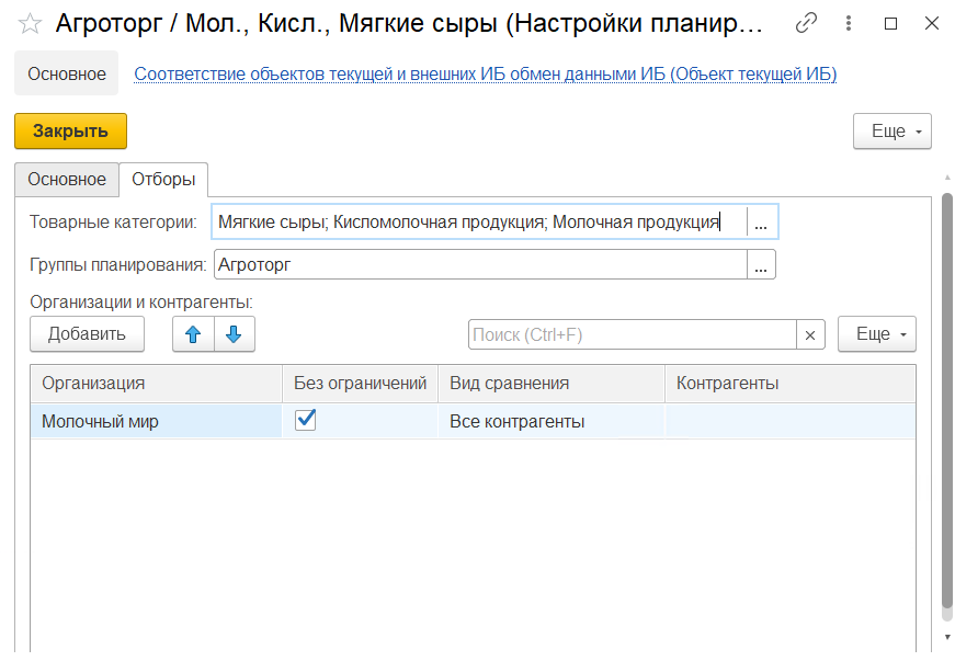 При создании настройки планирования на вкладке "Основное" указываются: