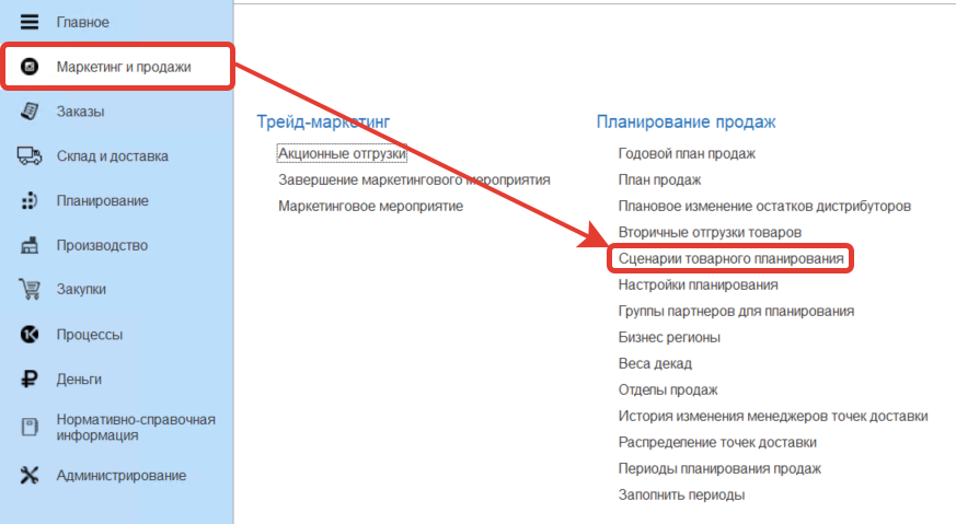 Справочник "Сценарии товарного планирования" расположен в разделе "Маркетинг и продажи" в подсистеме "Планирование продаж"