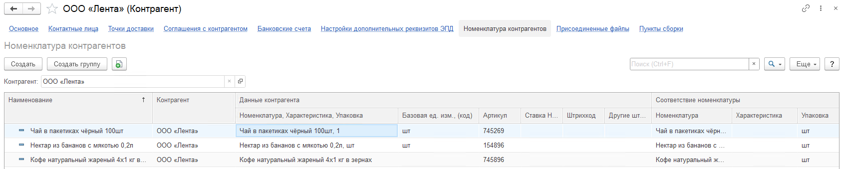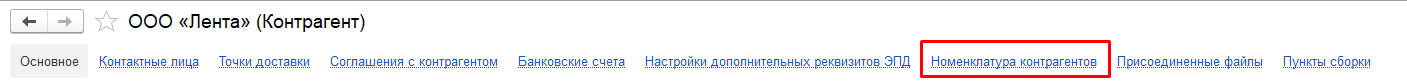 Чтобы перейти в справочник "Номенклатура контрагентов" нужно в карточке контрагента перейти нажать на гиперссылку "Номенклатура контрагентов"