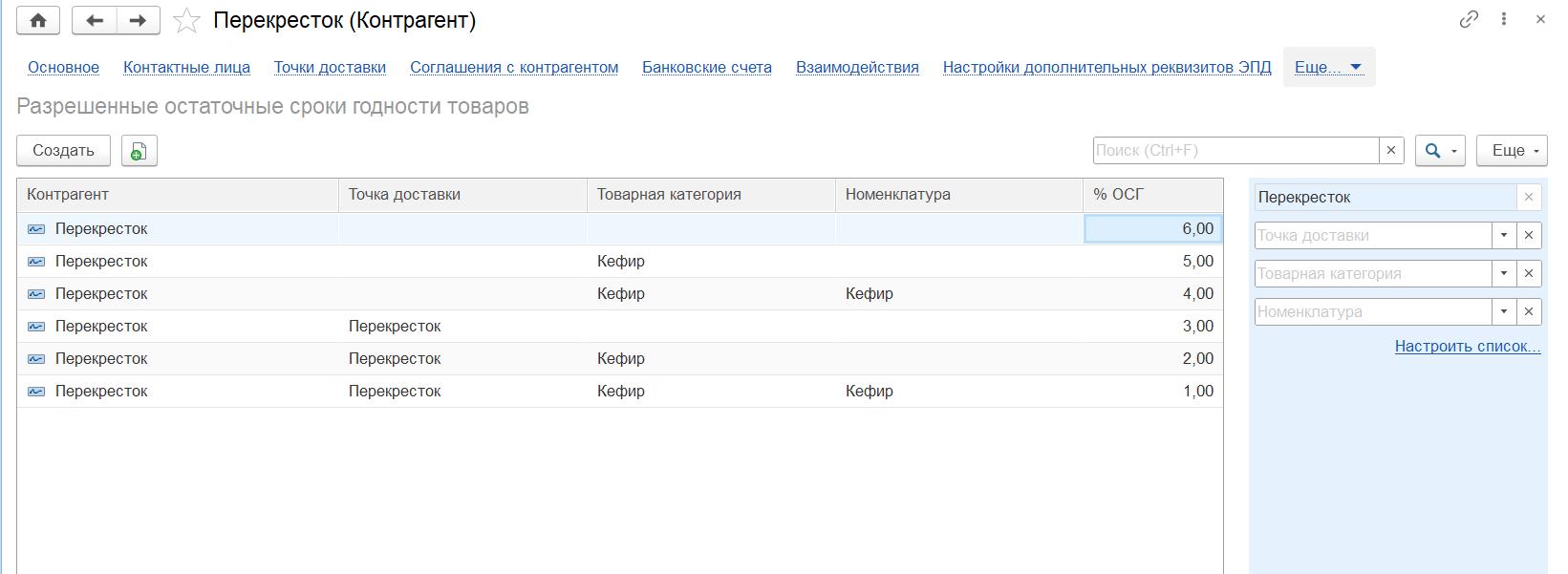В регистре идет уточнение %ОСГ до точек доставки, товарной категории, номенклатуры для контрагентов