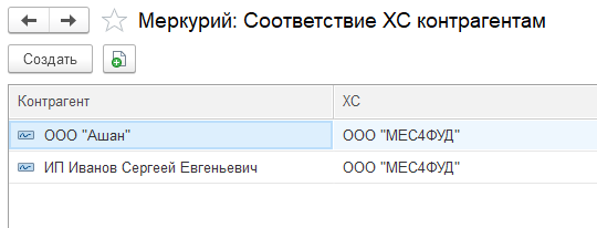 В регистре сведений "Меркурий: Соответствие ХС контрагентам" при заполнении контрагента осуществляется поиск ХС по ИНН.