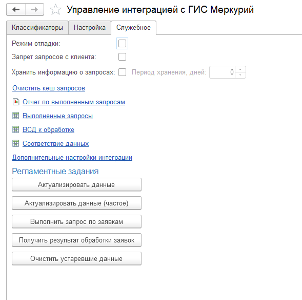 - Запрет запросов с клиента - запрещает отправлять запросы в ГИС Меркурий из клиентских сеансов, все общение происходит только через регламентные задания. Это нужно для случая, когда разные пользователи часто отправляют/получают что-то из ГИС Меркурий, постоянно нажимают на обновить и ГИС Меркурий начинает отдавать ошибку 429 TooManyRequests. У ГИС Меркурий ограничение на 5 запросов в секунду
