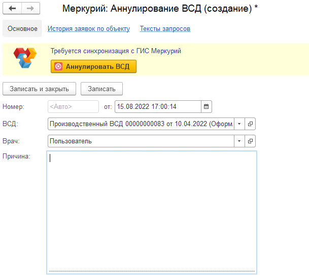 Способы выполнения: в случае, если ВСД необходимо аннулировать, то на основании ВСД создается документ "Аннулирование ВСД", в котором необходимо заполнить причину и синхронизировать документ.
