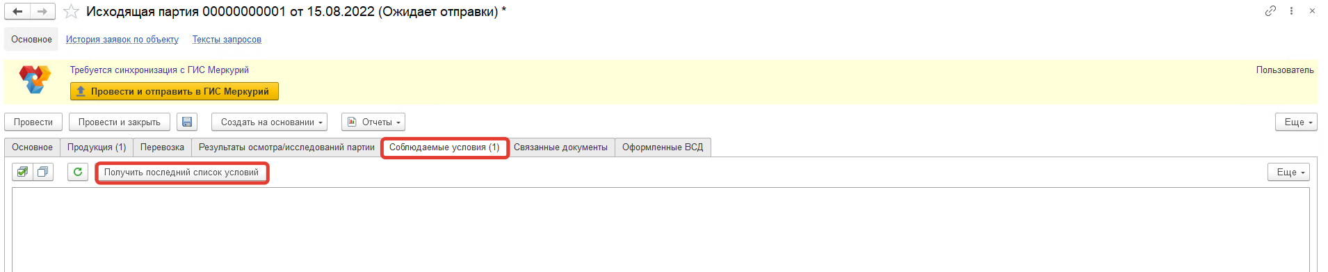 В исходящей партии есть вкладка "Соблюдаемые условия", команда "Получить последний список условий" открывает форму для отправки запроса в Меркурий по правилам перемещения, где будут подобраны условия в разрезе вида продукции и регионов отправителя и получателя.