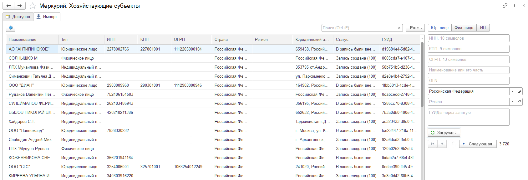 ХС можно загрузить из ГИС Меркурий. Пользуясь отборами рекомендуется сокращать запросы в ГИС Меркурий. Для этого на вкладке Импорт в справочнике Хозяйствующие субъекты устанавливаются необходимые отборы. Для того чтобы перенести элементы ХС в справочник нужно выделить необходимые позиции и нажать на кнопку Создать элементы по выбранным строкам (синяя стрелка).