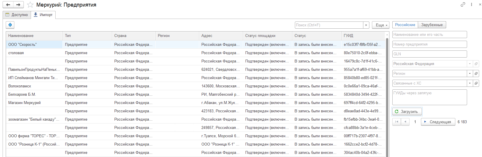 Загрузка из веб реализуется аналогично загрузке хозяйствующих субъектов с помощью закладки импорт на общем списке предприятий.