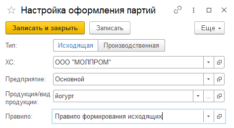 Настройки оформления партий используются в АРМе ветеринарного врача. Нужны для автоматического заполнения производственной и исходящей партий. В разрезе ХС, предприятия, наименования продукции или вида продукции можно задать параметры заполнения – правила.