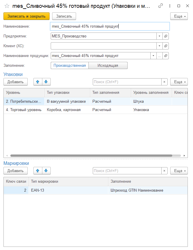 - Расчетный - упаковка определяется расчетным способом из раздела фасовки в наименовании продукции. Применимо для заполнения исходящих партий на основании реализаций и перемещений