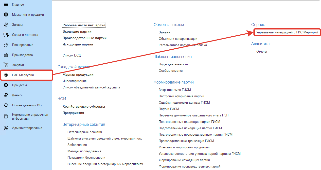 Открыть ГИС Меркурий - Сервис – Управление Интеграцией с ГИС Меркурий. Откроется обработка с настройками Меркурия