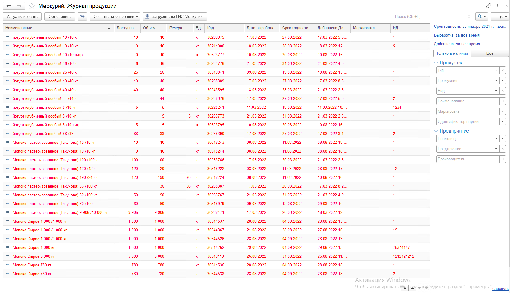 В справочнике "Журнал продукции" содержатся сведения об остатках продукции. Остатки хранятся в разрезе ХС владельца и Предприятия владельца. Для удобства работы можно пользоваться отборами в правой части.