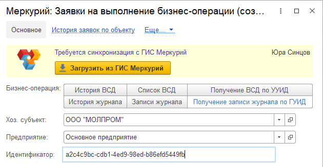 Командой "Загрузить из ГИС Меркурий" можно вызвать форму обмена с ГИС Меркурий для отправки заявок в ГИС Меркурий. И выбрать вид бизнес-операции Получение записи журнала по ГУИД.