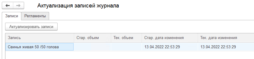- Кнопка "Актуализировать". Она выполняет принудительную актуализацию - очищает уид версии и получает для каждого переданного журнала по гуид запись, перезаписывая полностью. Это позволяет обойти ситуацию, когда на записи версия актуальная, но запись почему-то не актуальная