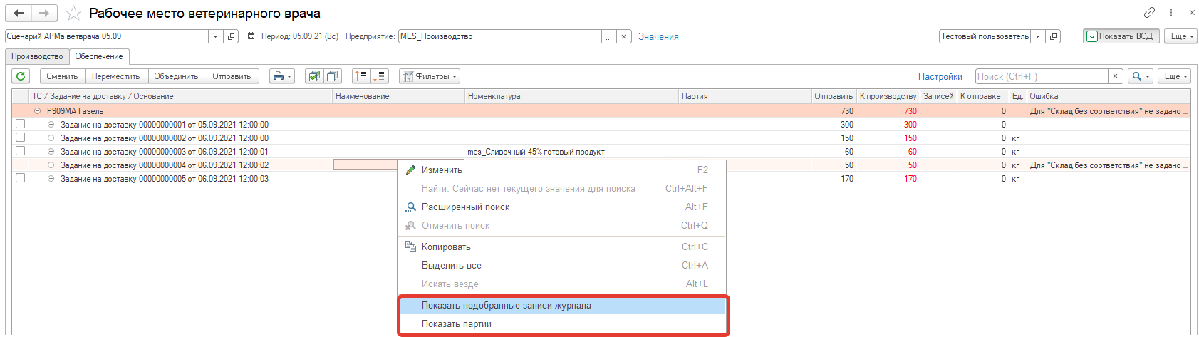 По правой кнопке мыши на строке в дереве можно открыть связанные документы партий и подобранные записи журнала.