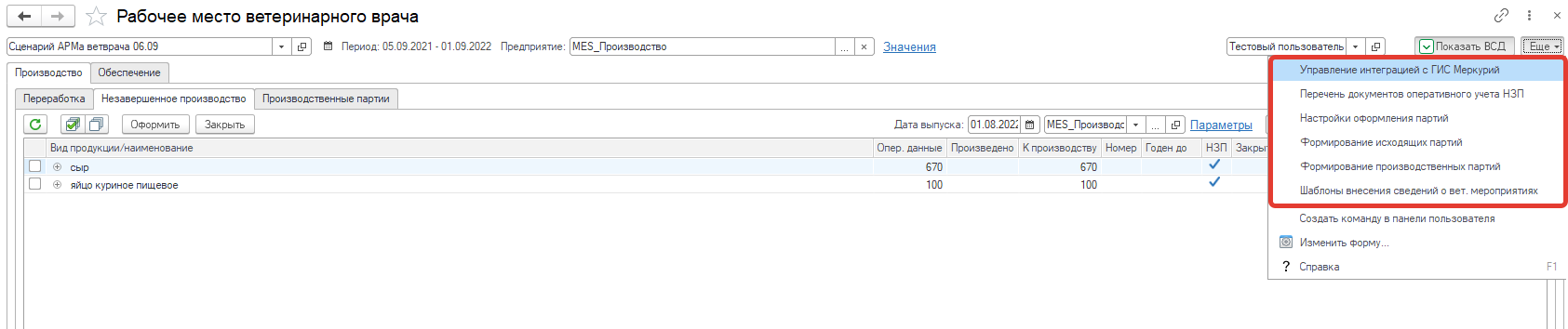 - Производство – вкладка на которой происходит создание производственных партий на основании данных оперативного учета