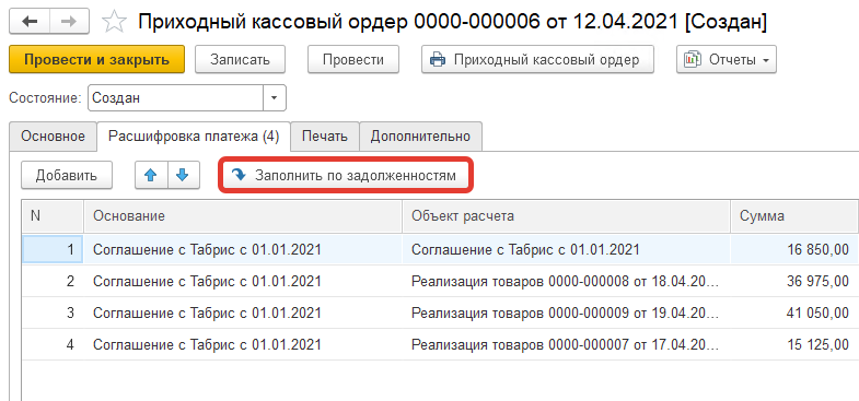 - Приходный кассовый ордер с операцией Поступление оплаты