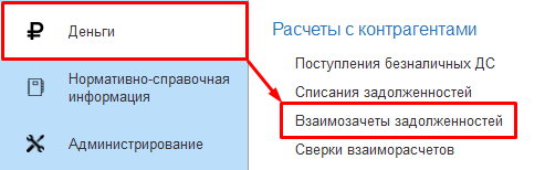 Документы "Взаимозачеты задолженностей" расположены в разделе "Деньги" - "Расчеты с клиентами".