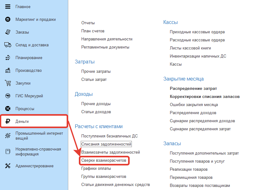 Документы "Сверки взаиморасчетов" расположены в разделе "Деньги" - "Расчеты с клиентами".