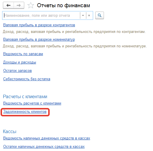 Отчет "Задолженность клиентов" расположен в разделе "Деньги" - Отчеты