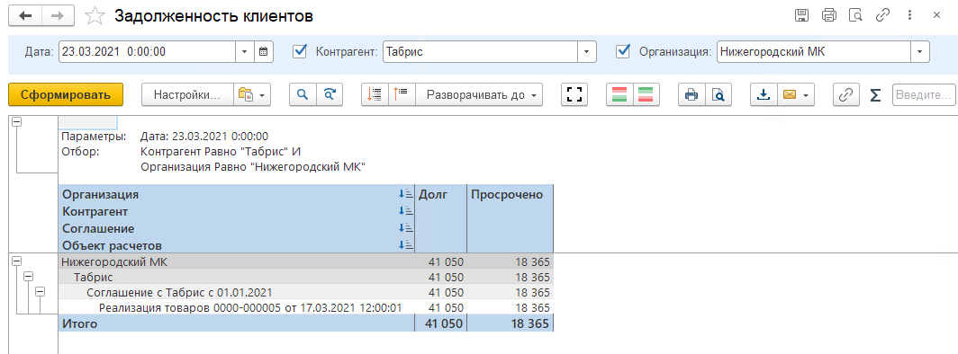 Отчет "Задолженность клиентов" выводит информацию о задолженности клиента/клиентов на определенную дату.