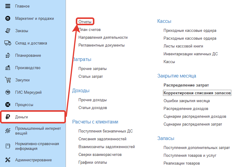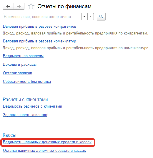 Отчет "Ведомость наличных денежных средств в кассах" расположен в разделе "Деньги" - Отчеты