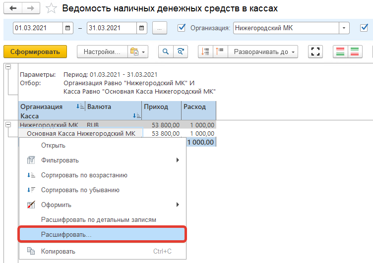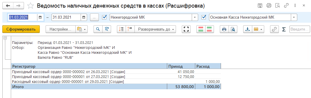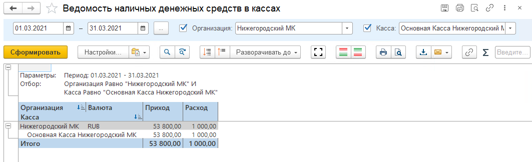 Отчет "Ведомость наличных денежных средств в кассах" выводит информацию о приходах и расходах наличных денежных средств организации в кассе\кассах за определенный период.