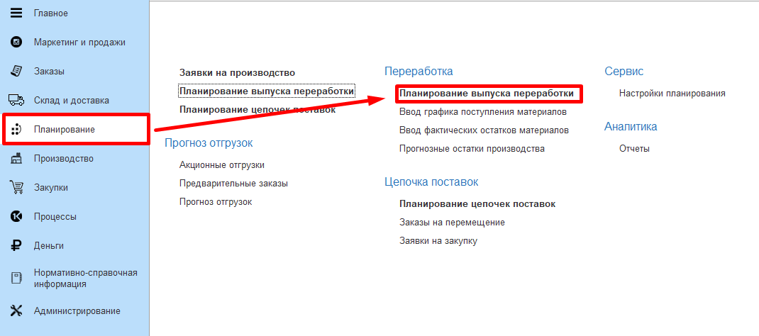 Перейдем в подсистему "Планирование" - "Планирование выпуска переработки".