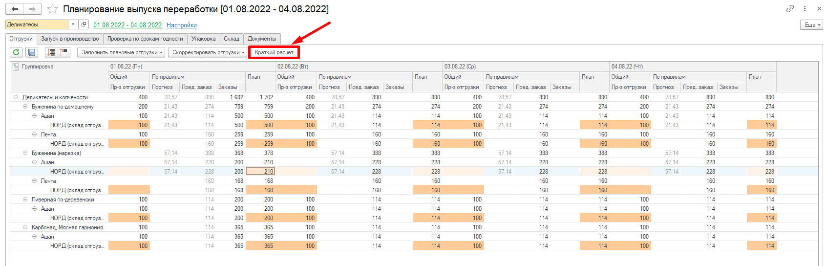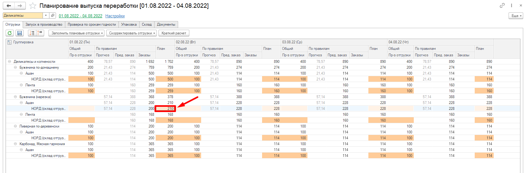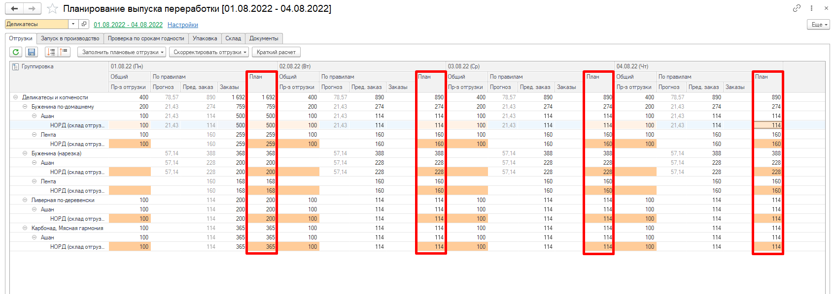 Видим, что заполнилась колонка План. Она рассчитывается на основании заданного в системе Применение правила расчета отгрузок.