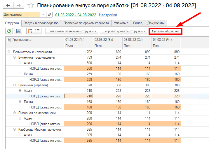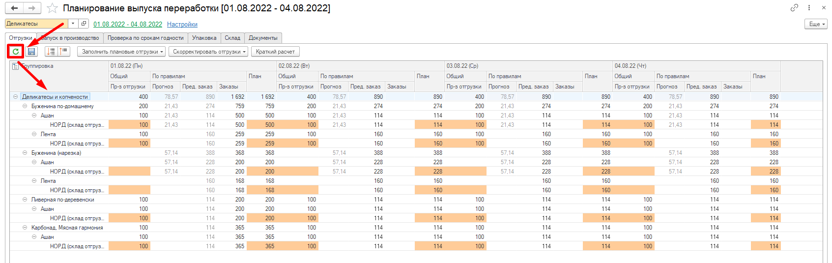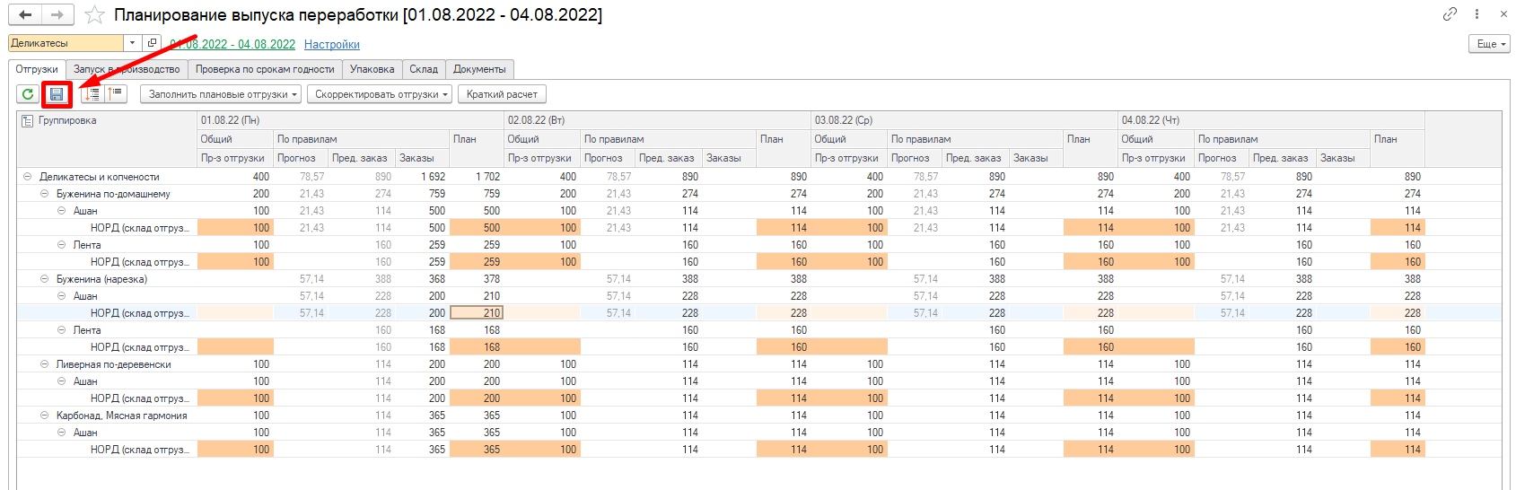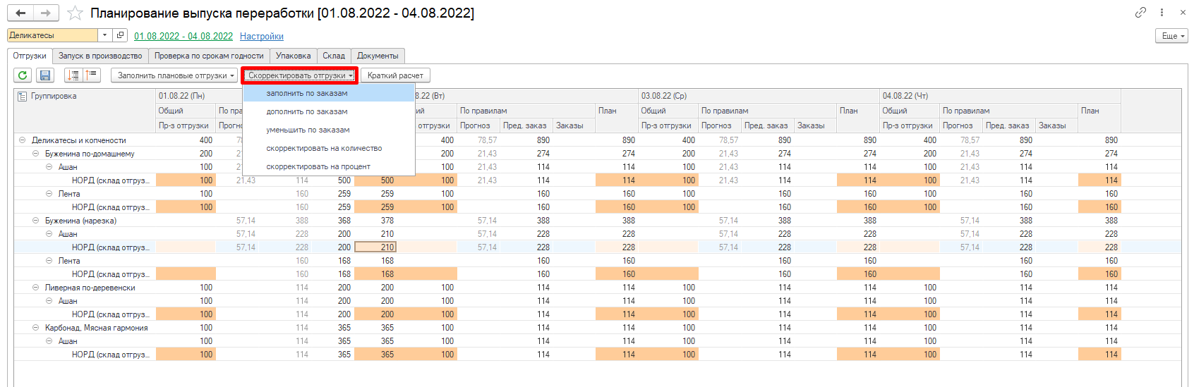 Для планирования потребностей на период используется АРМ “Планирование выпуска переработки”, вкладка Отгрузки.