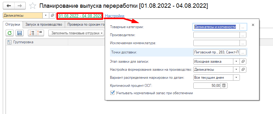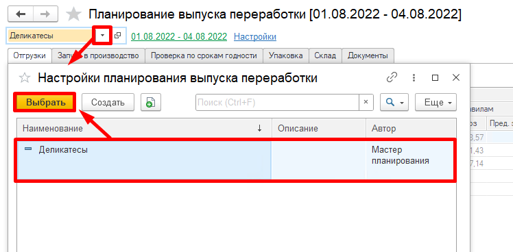 Укажем созданную ранее "Настройку планирования выпуска переработки":