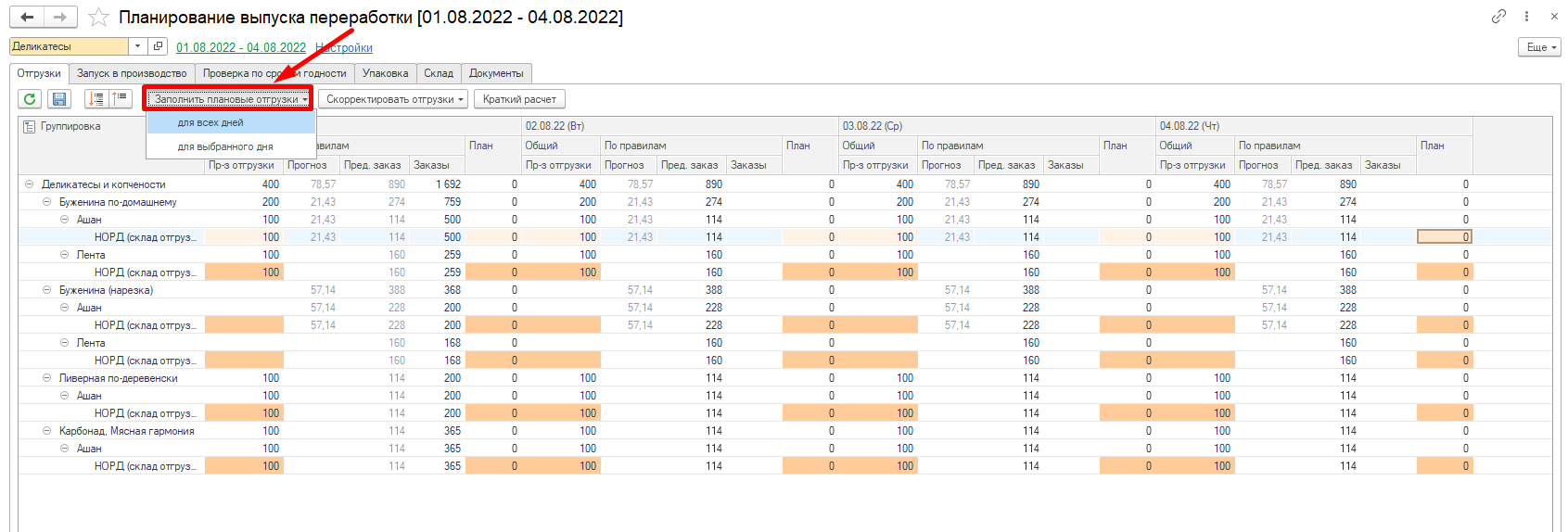 Чтобы заполнить план потребностей в отгрузке нажмем Заполнить плановые отгрузки: