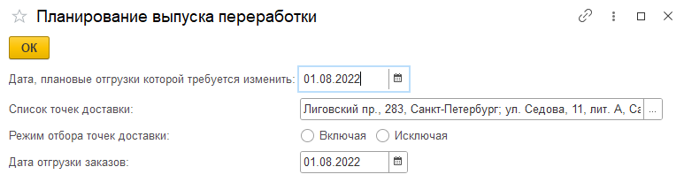 В открывшемся окне указываем: дату, плановые отгрузки которой требуется изменить; список точек доставки; режим отбора точек доставки; дату отгрузки заказов.