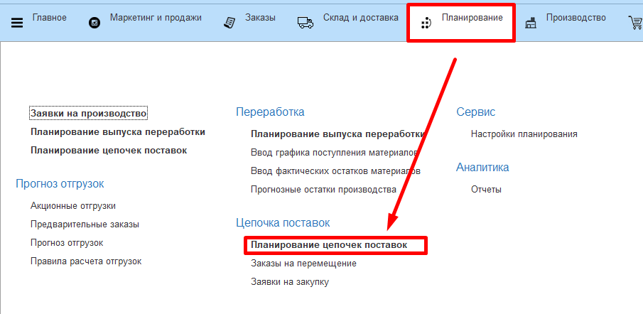 Перейдем в подсистему "Планирование" - "Планирование цепочек поставок".