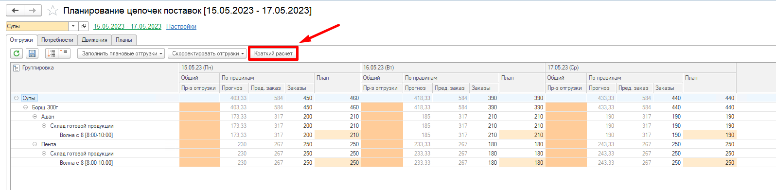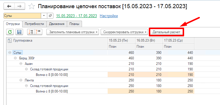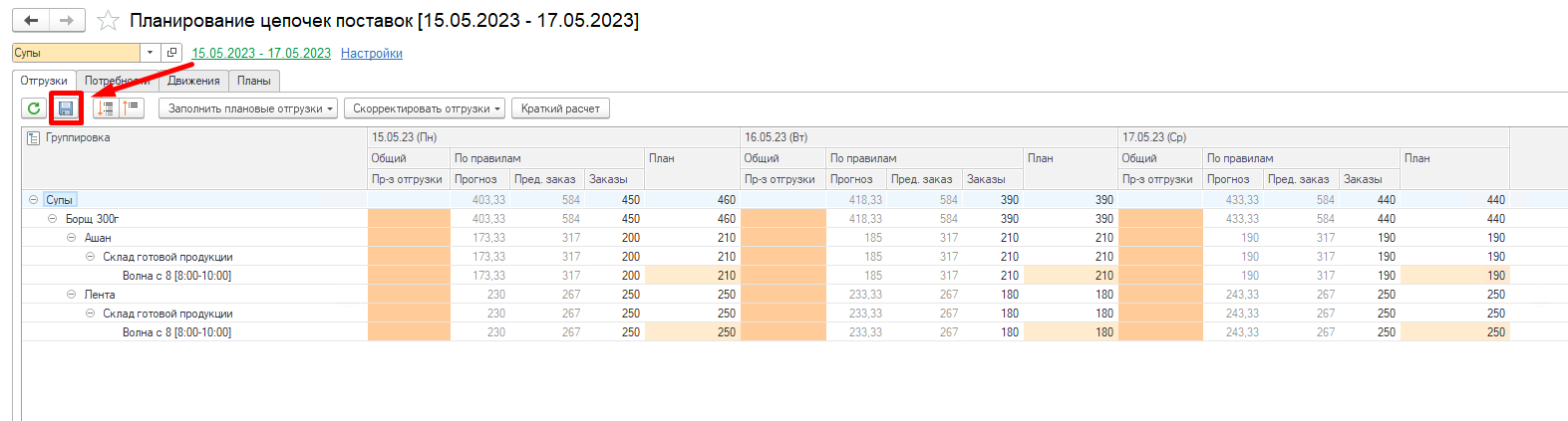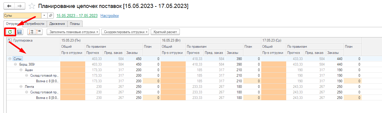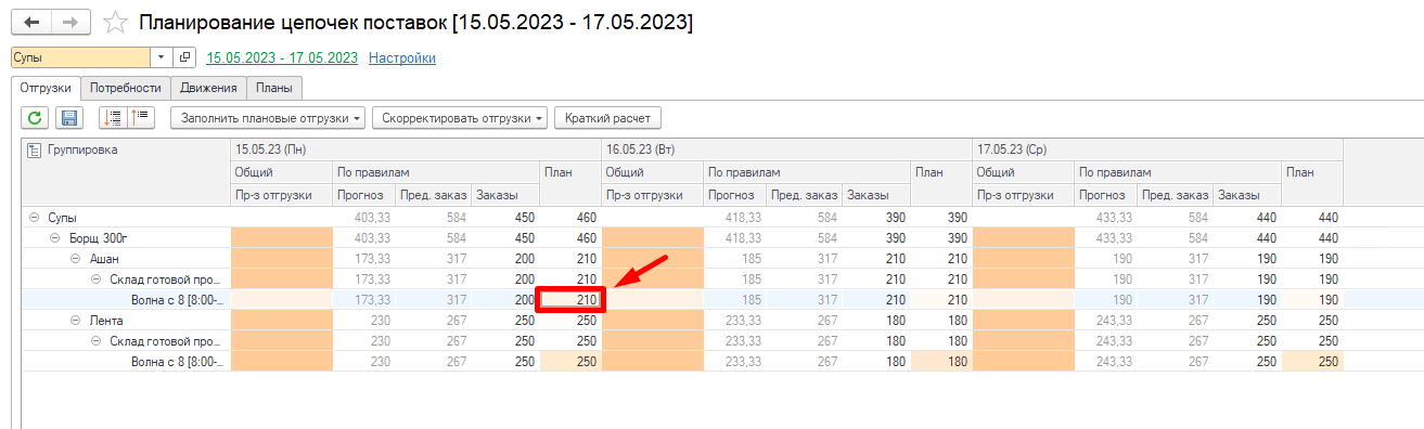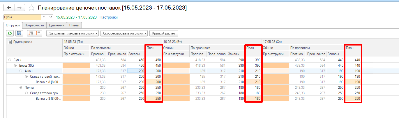 Видим, что заполнилась колонка План. Она рассчитывается на основании заданного в системе Применение правила расчета отгрузок.