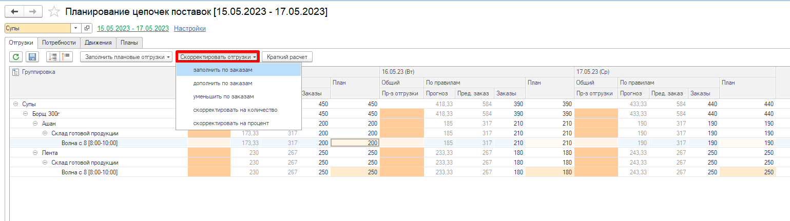 Для планирования потребностей на период используется АРМ “Планирование цепочек поставок”, вкладка Отгрузки.