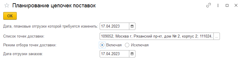 В открывшемся окне указываем: дату, плановые отгрузки которой требуется изменить; список точек доставки; режим отбора точек доставки; дату отгрузки заказов.