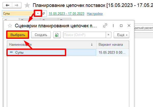 Укажем созданный ранее "Сценарий планирования цепочек поставок":
