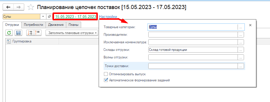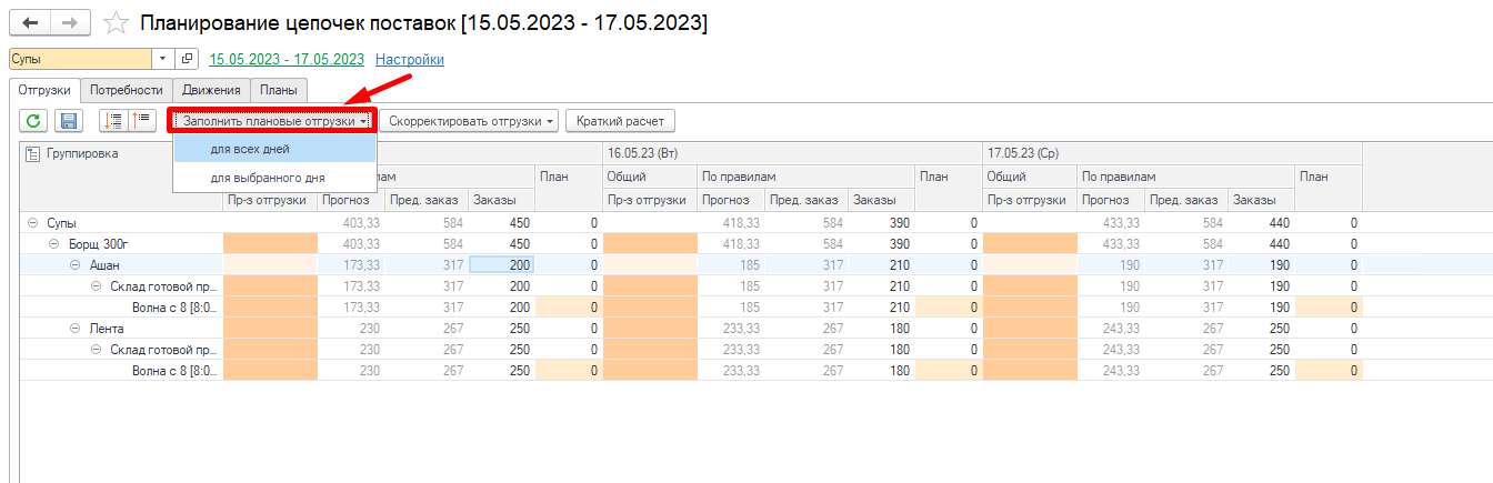 Чтобы заполнить план потребностей в отгрузке нажмем Заполнить плановые отгрузки: