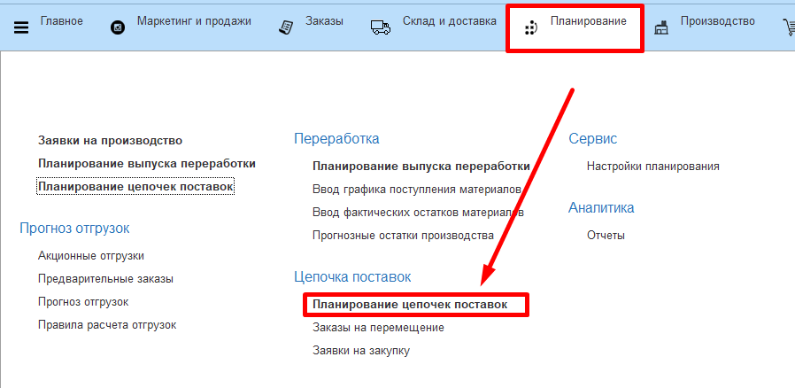 Для этого выберем подсистему "Планирование" - "Планирование цепочек поставок".