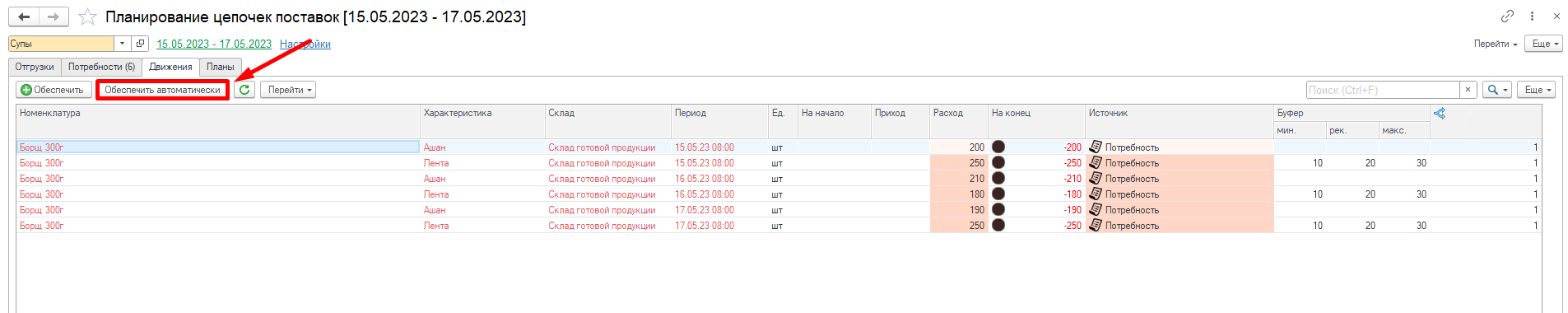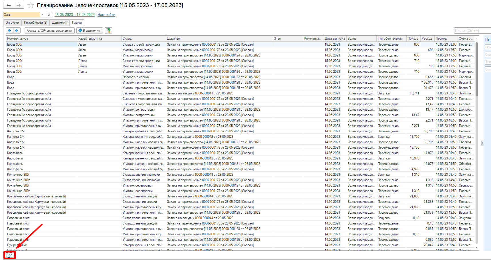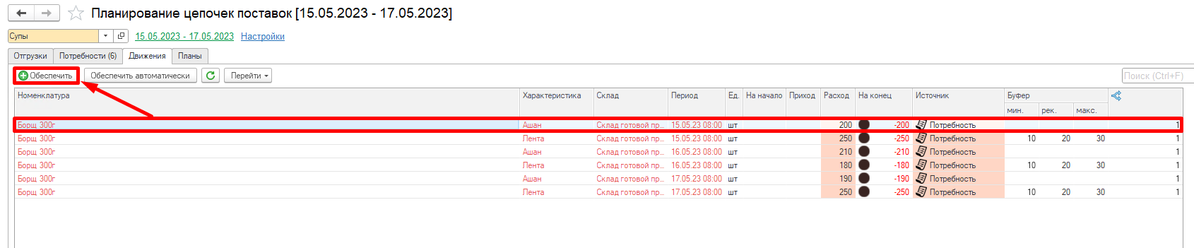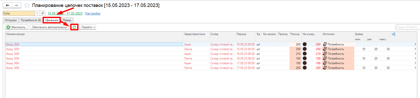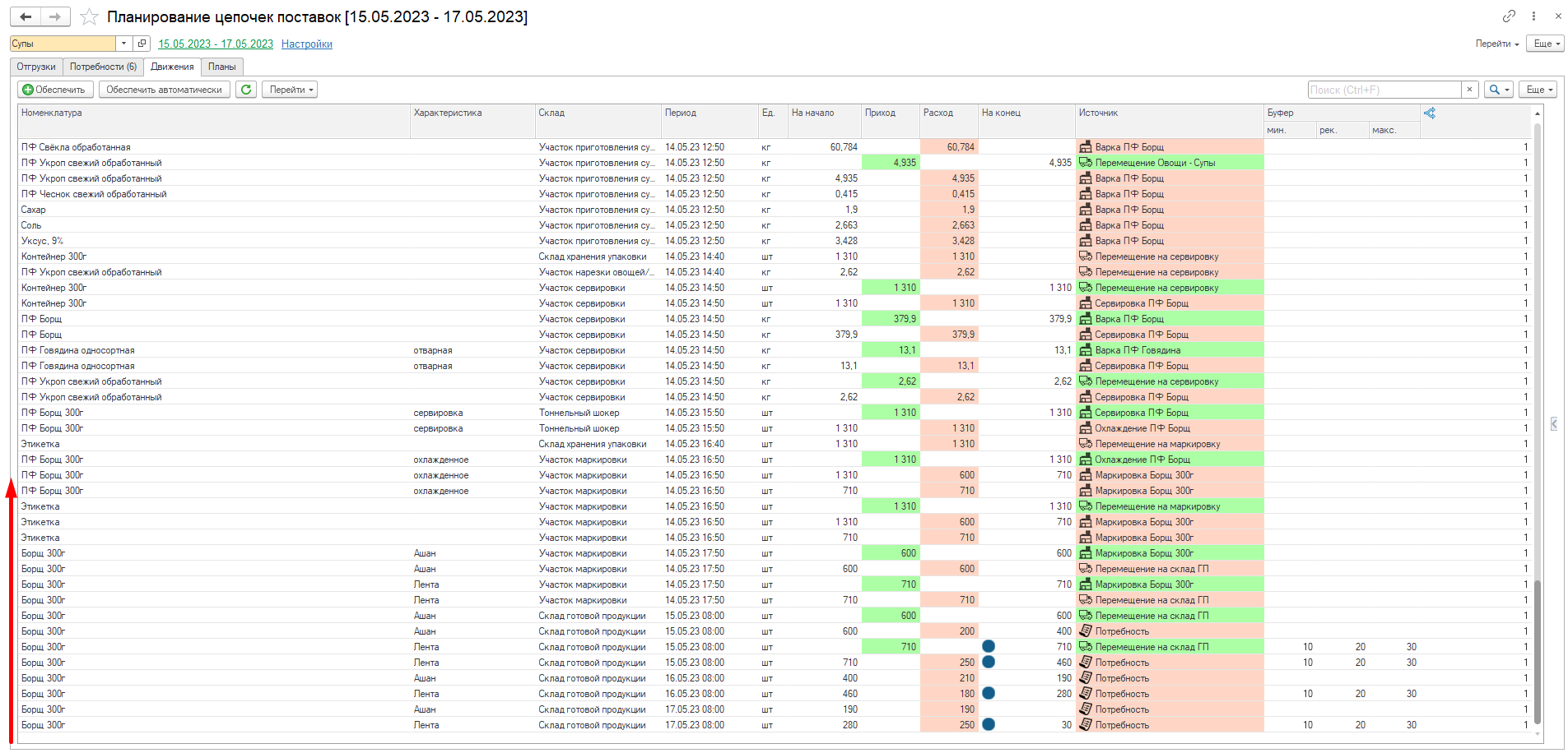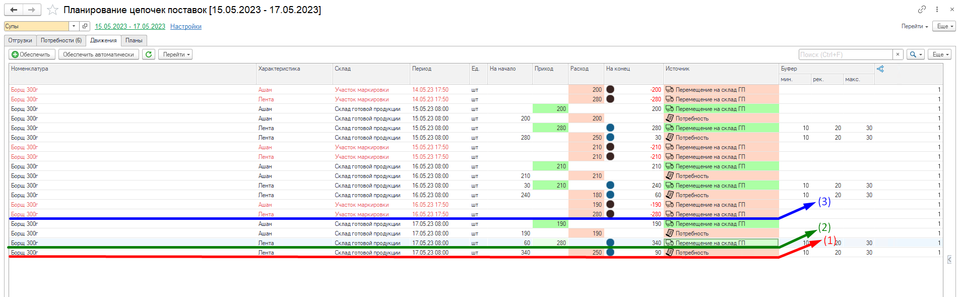 Видим, что в системе разузловалась цепочка начиная от потребности, заканчивая закупкой сырья. Например, была потребность в Борщ 300 г - Лента - Потребность (1), для его обеспечения необходимо переместить Борщ 300г - Лента - Перемещение на склад ГП (2). Чтобы переместить необходимо сначала изготовить (3) и тд.