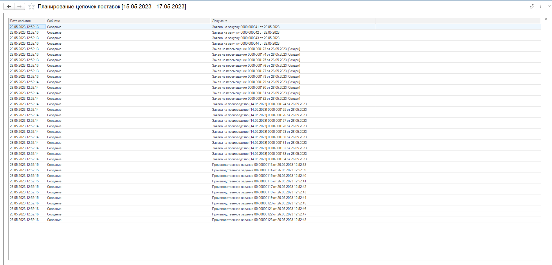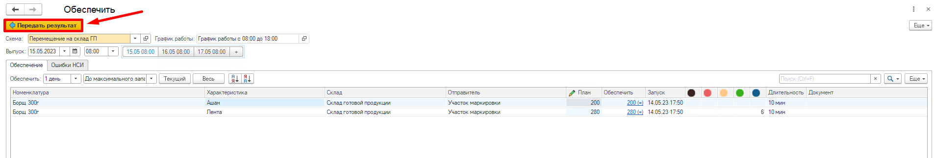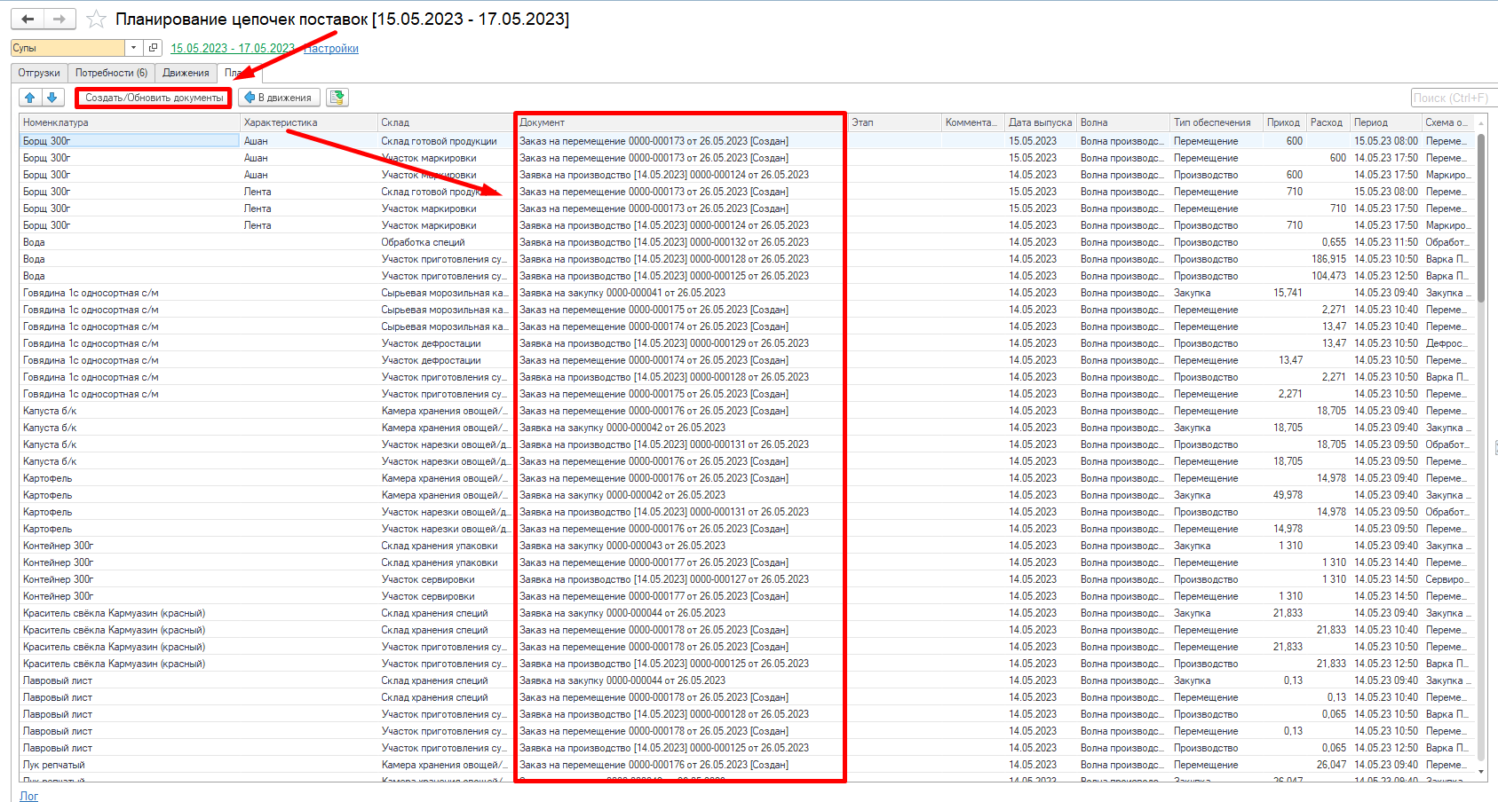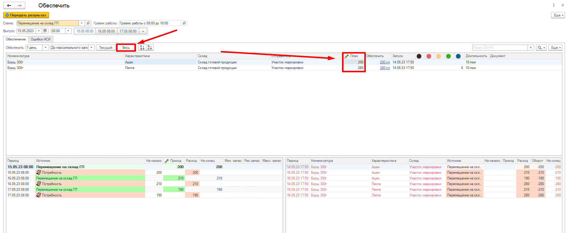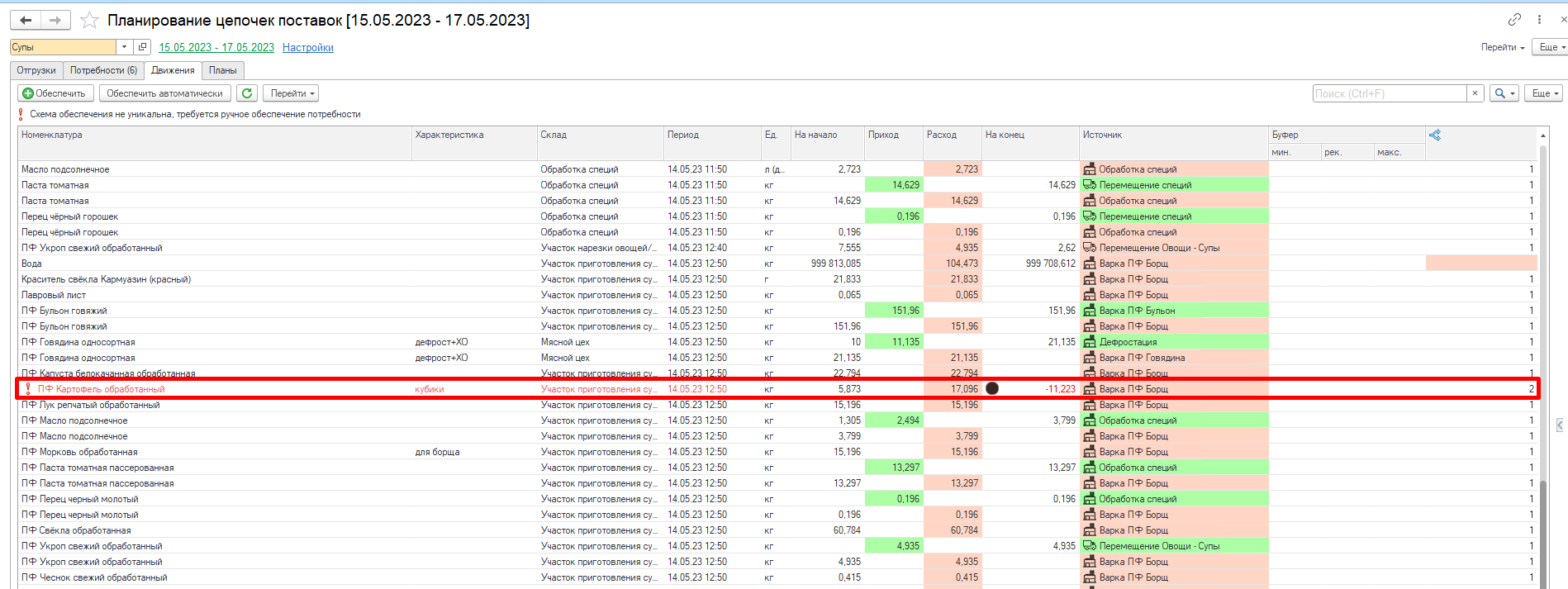 Видим, что в системе разузловалась цепочка начиная от потребности, заканчивая закупкой сырья. Например, была потребность в Борщ 300 г - Лента - Потребность (1), для его обеспечения необходимо переместить Борщ 300г - Лента - Перемещение на склад ГП (2). Чтобы переместить необходимо сначала изготовить (3) и тд.